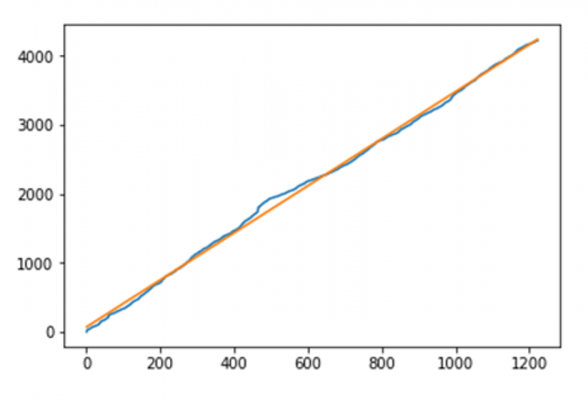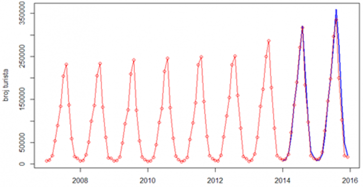 Usporedimo li prediktivni model s povijesnim podacima, možemo vidjeti kako model s jako malim odstupanjem predviđa broj noćenja i dvije godine unaprijed. Na grafu crvenom linijom su prikazani stvarni povijesni podaci broja noćenja, a plava je predikcija po modelu