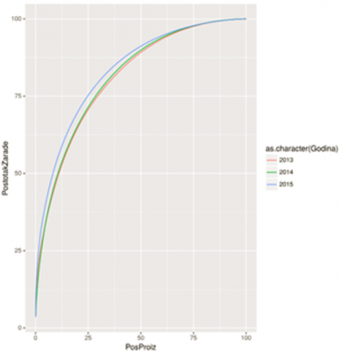 Klijent je želio istražiti može li optimizirati svoju ponudu, a da pri tome nema negativan učinak na prihod. Graf pokazuje odnos postotka jedinstvenih proizvoda u odnosu na postotak od ukupne prodaje, jasno naznačuje da je tek u 2015. napravljena prava selekcija prodajnog asortimana. Gdje je s 25% jedinstvenih proizvoda ostvareno 75% prihoda, s time da […]